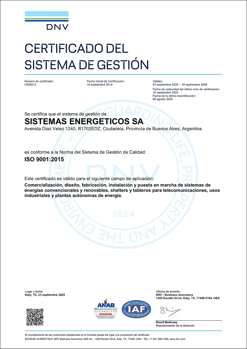 El alcance de esta certificación comprende nuestras actividades de comercialización, diseño, fabricación, instalación y puesta en marcha de sistemas de energía convencionales y renovables, shelters y tableros para telecomunicaciones, usos industriales y plantas autónomas de energía.