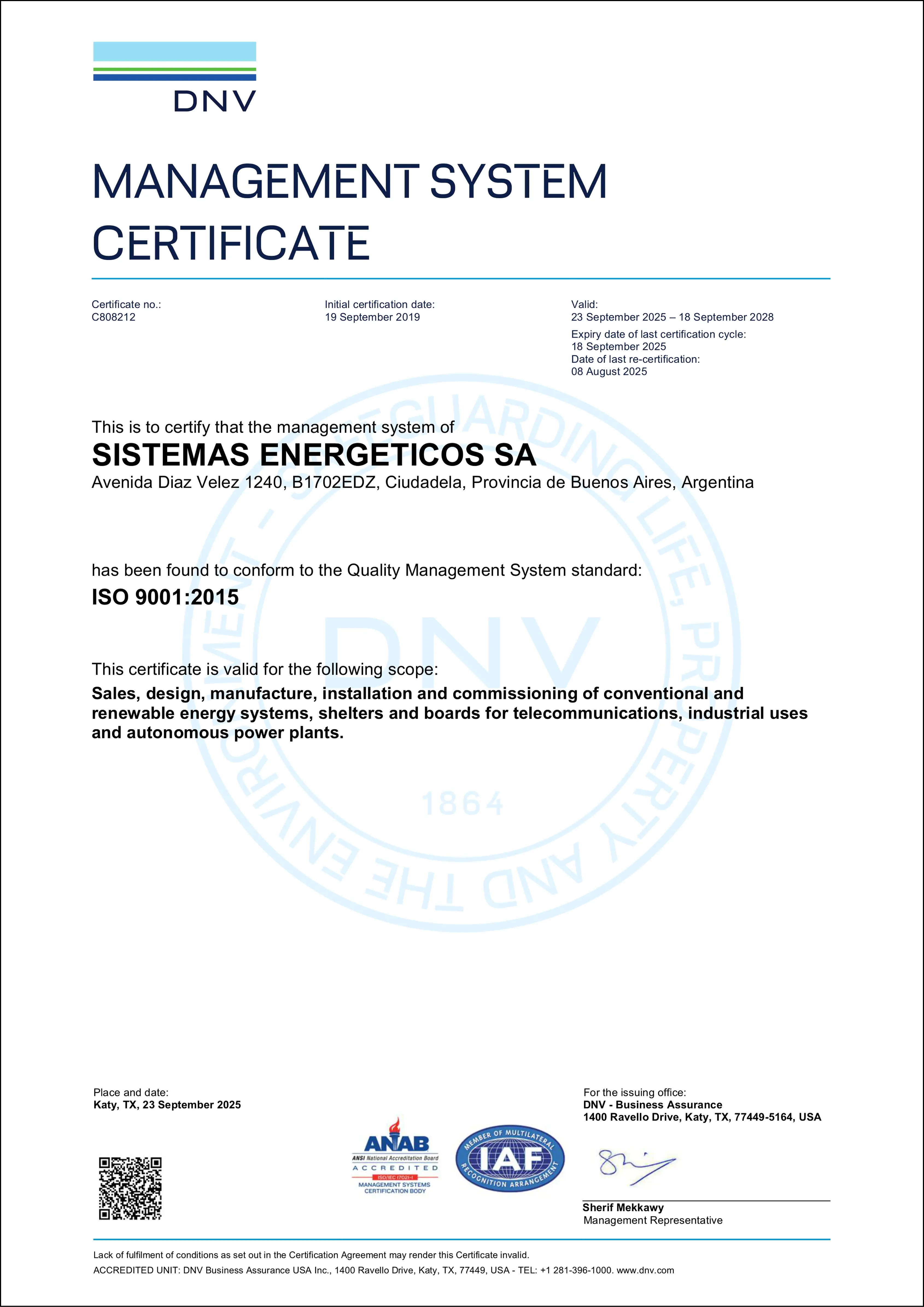 Renovamos nuestra certificación ISO 9001:2015, otorgada por DNV Business Assurance USA Inc, vigente desde septiembre de 2025 hasta septiembre de 2028.