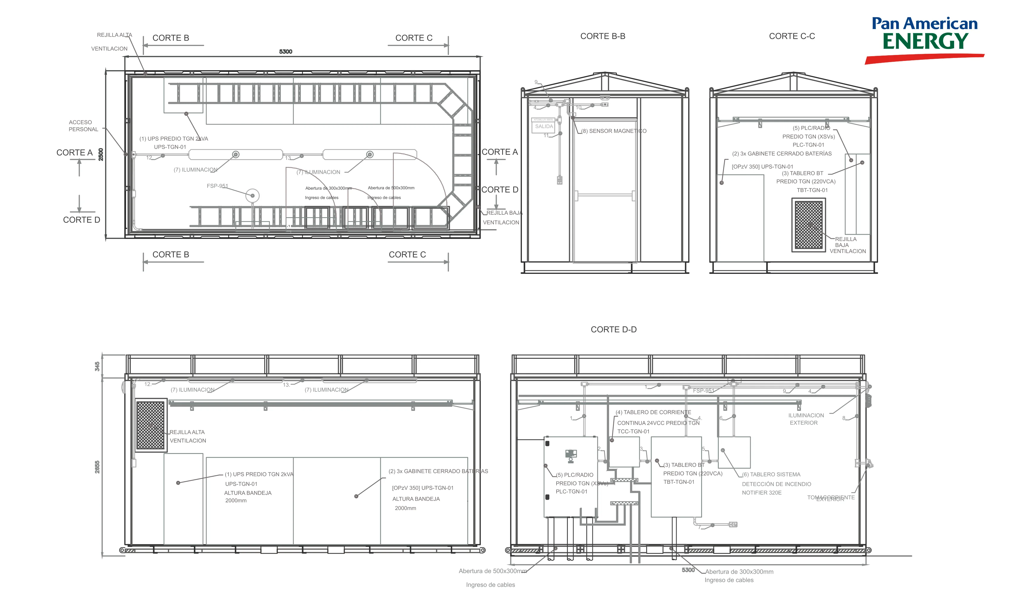 • Tres gabinetes cerrados para baterías con tecnología OPzV 350, asociados al sistema de UPS, ofreciendo autonomía y fiabilidad en el almacenamiento energético.