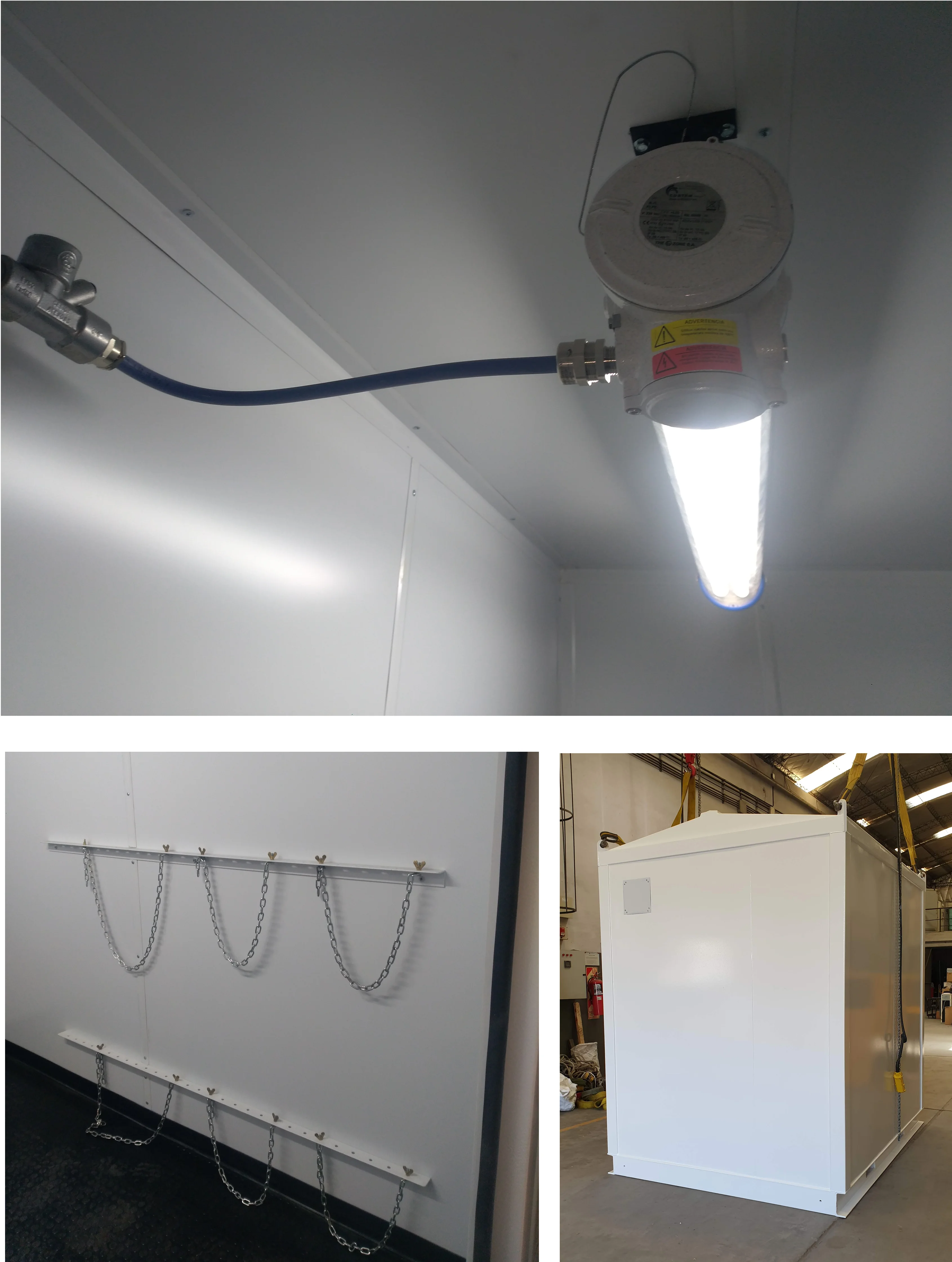 • Cadenas de sujeción resistentes para mantener los cilindros en posición, evitando desplazamientos durante operaciones o eventos sísmicos menores.
