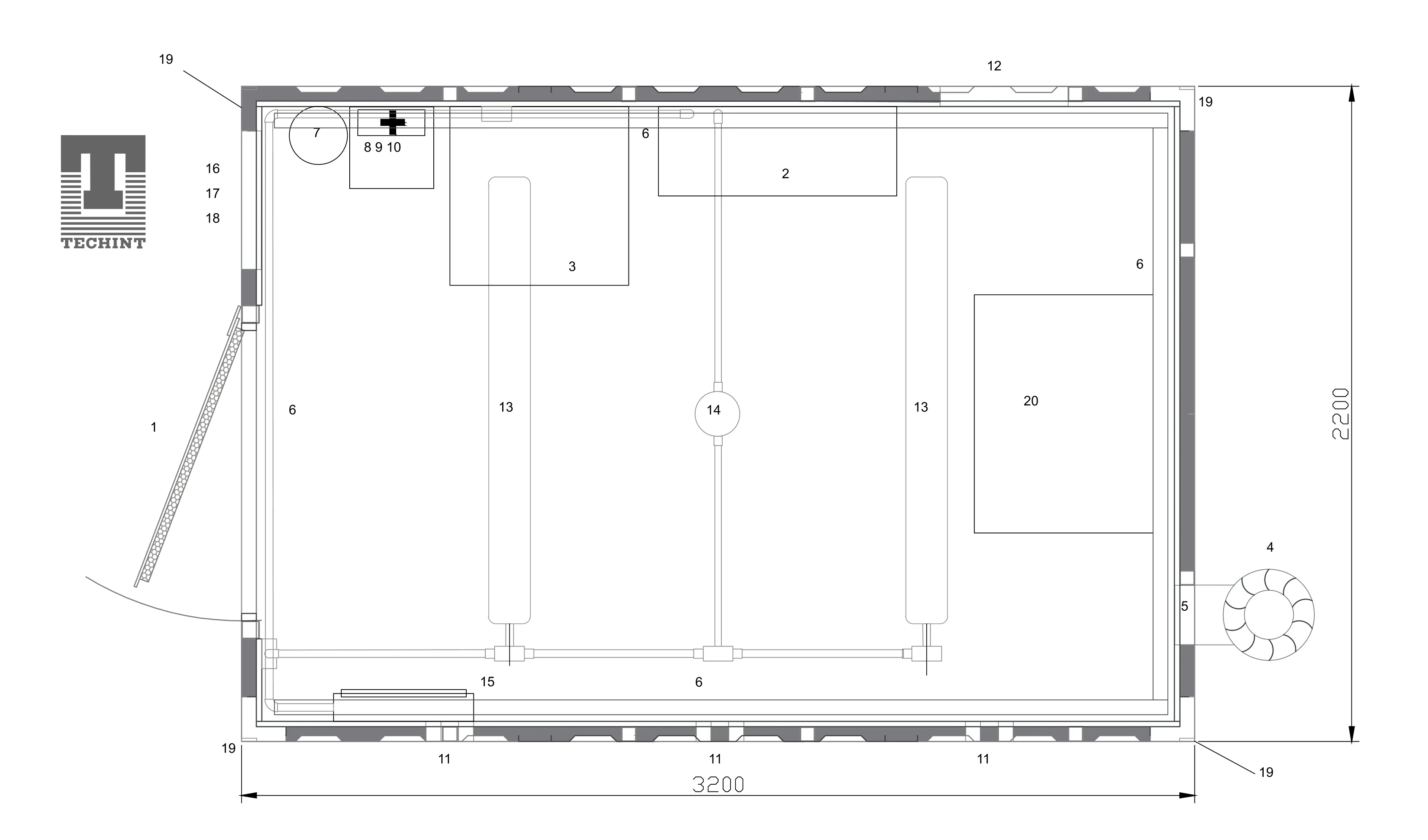 • Perforaciones para caño de 2” y pase para cable de Instrumentación y Control (I&C), preparados para conexiones de campo.